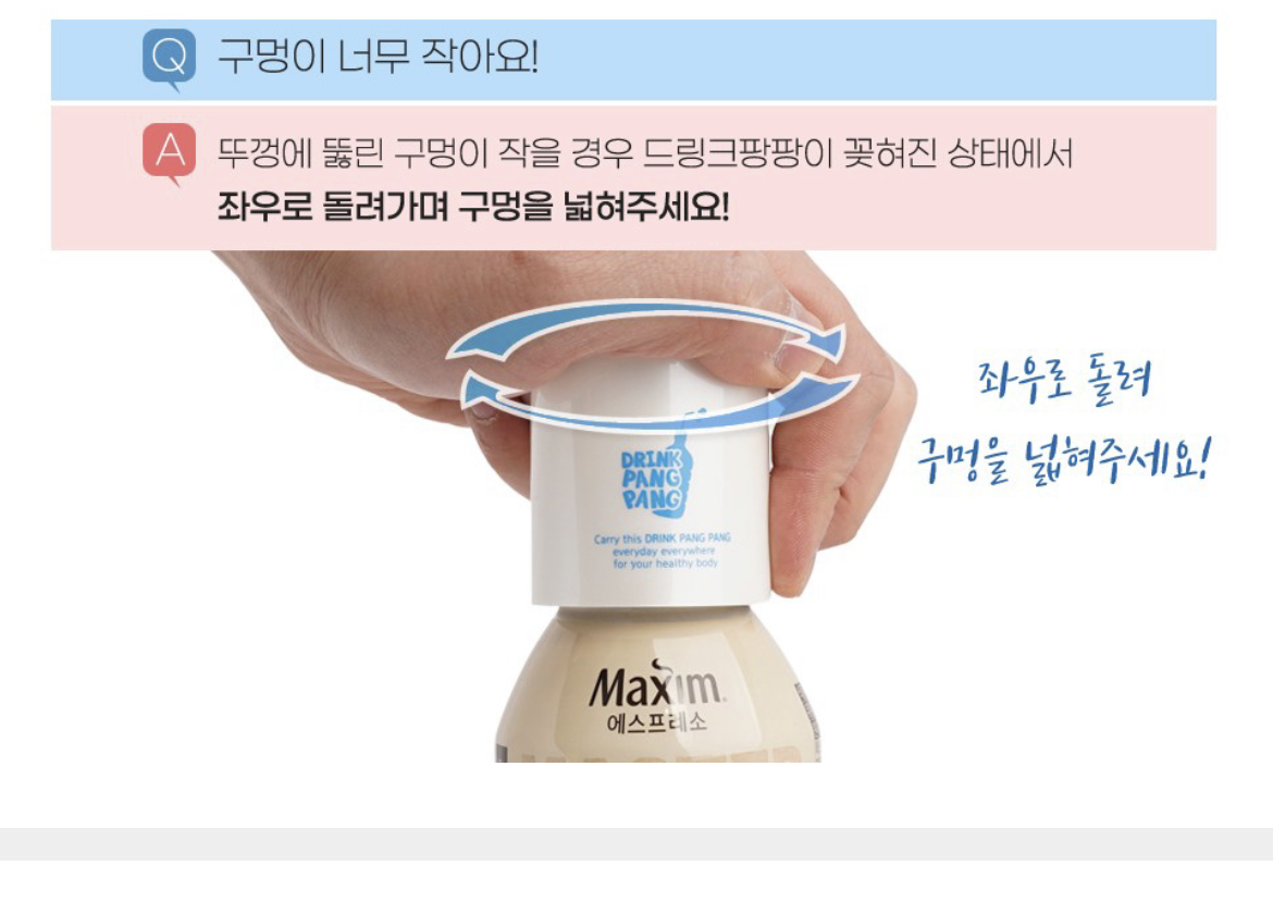 혹시 구멍이 작으면 드링크 팡팡으로 구멍을 뚫은 상태에서 좌, 우로 돌려가며 구멍을 넓혀주세요 !!