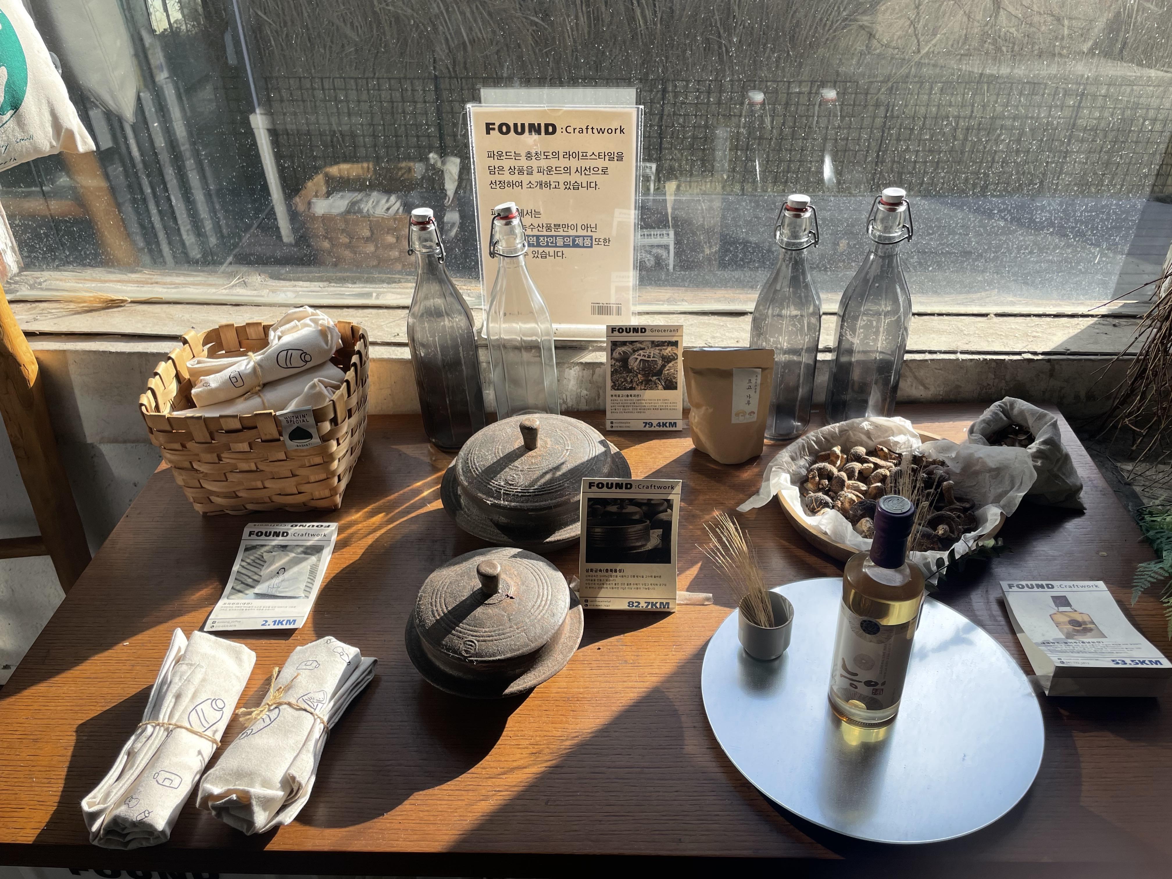 " FOUND는 충청도 지역 기반의 식재료를 이용하여 요리하는 레스토랑으로 역사가 담긴 공간에서 충청도의 라이프스타일을 담은 상품을 파운드의 시선으로 선정하여 소개하고 있습니다. 다양한 농수산품, 장인들의 제품뿐만이 아닌 지역의 시간을 고스란히 간직한 조각들 또한 만나볼 수 있습니다. "