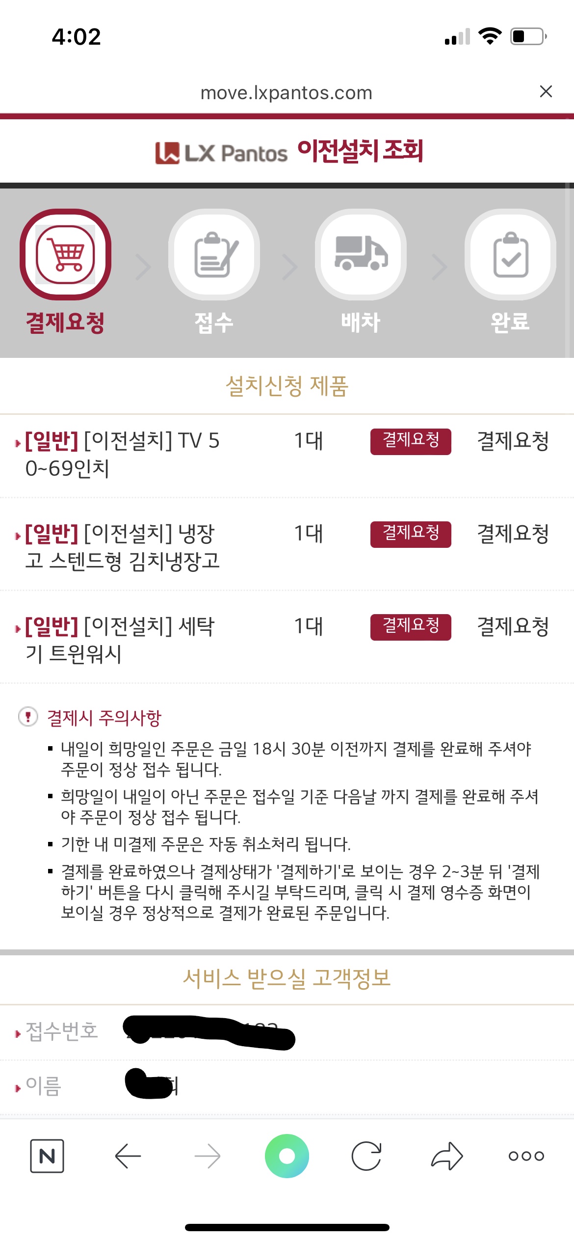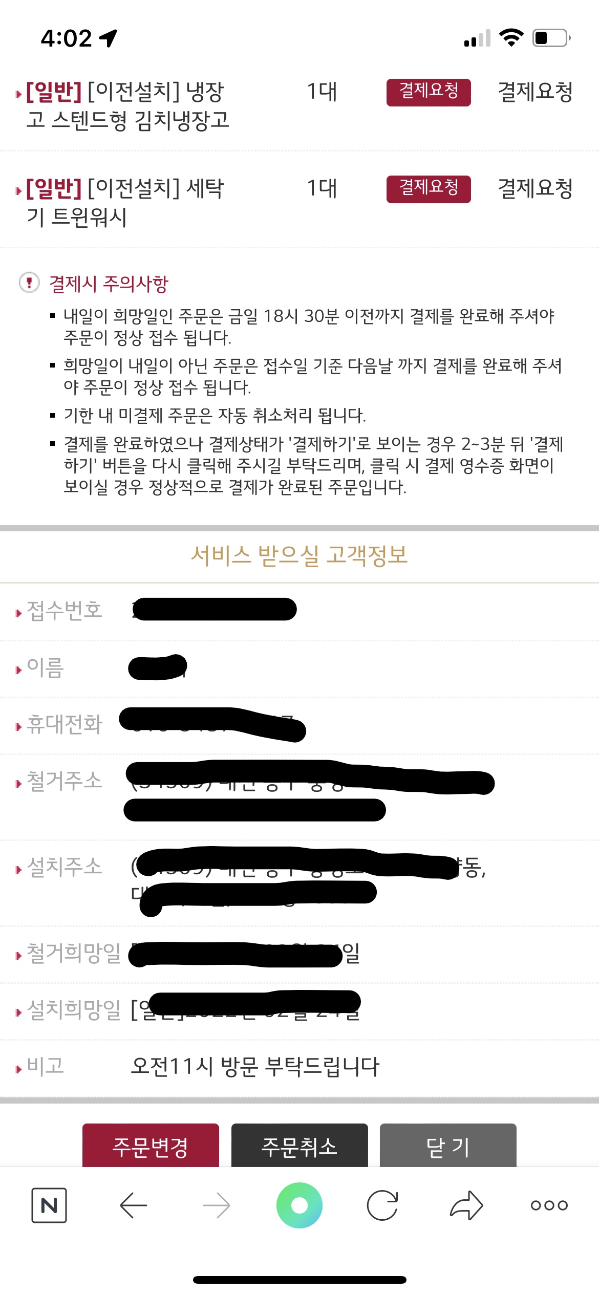 입력 후 결제창이 떠요 주소와 가전제품을 잘 선택했는지 확인 후 결제 완료