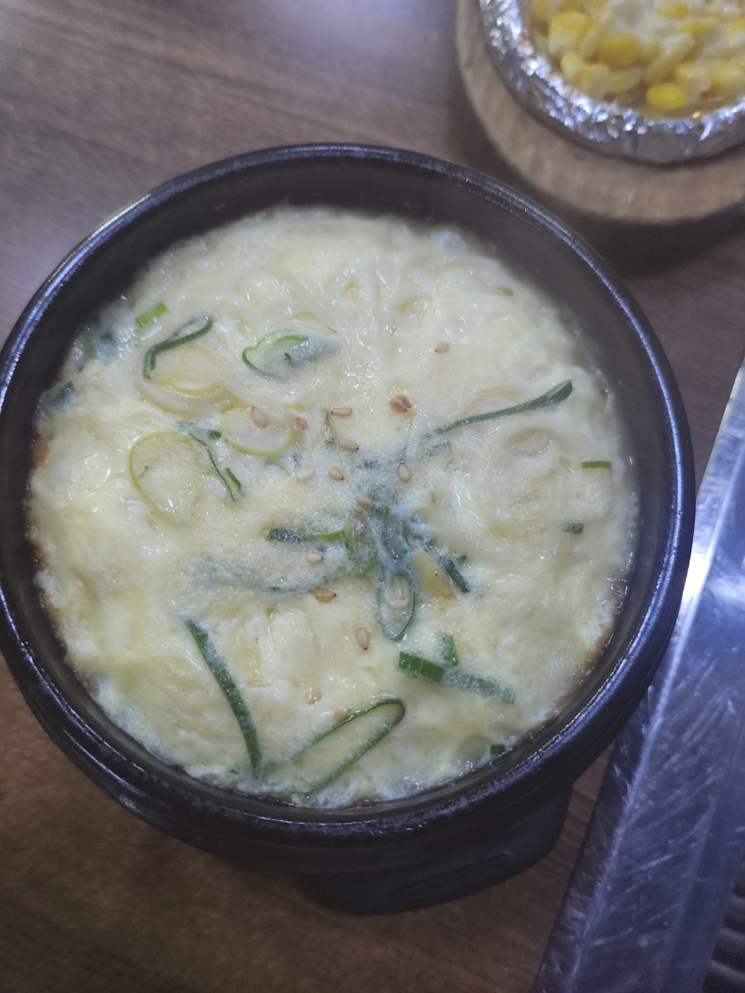 콘치즈와 두부김치, 숭늉, 계란찜이 나와요