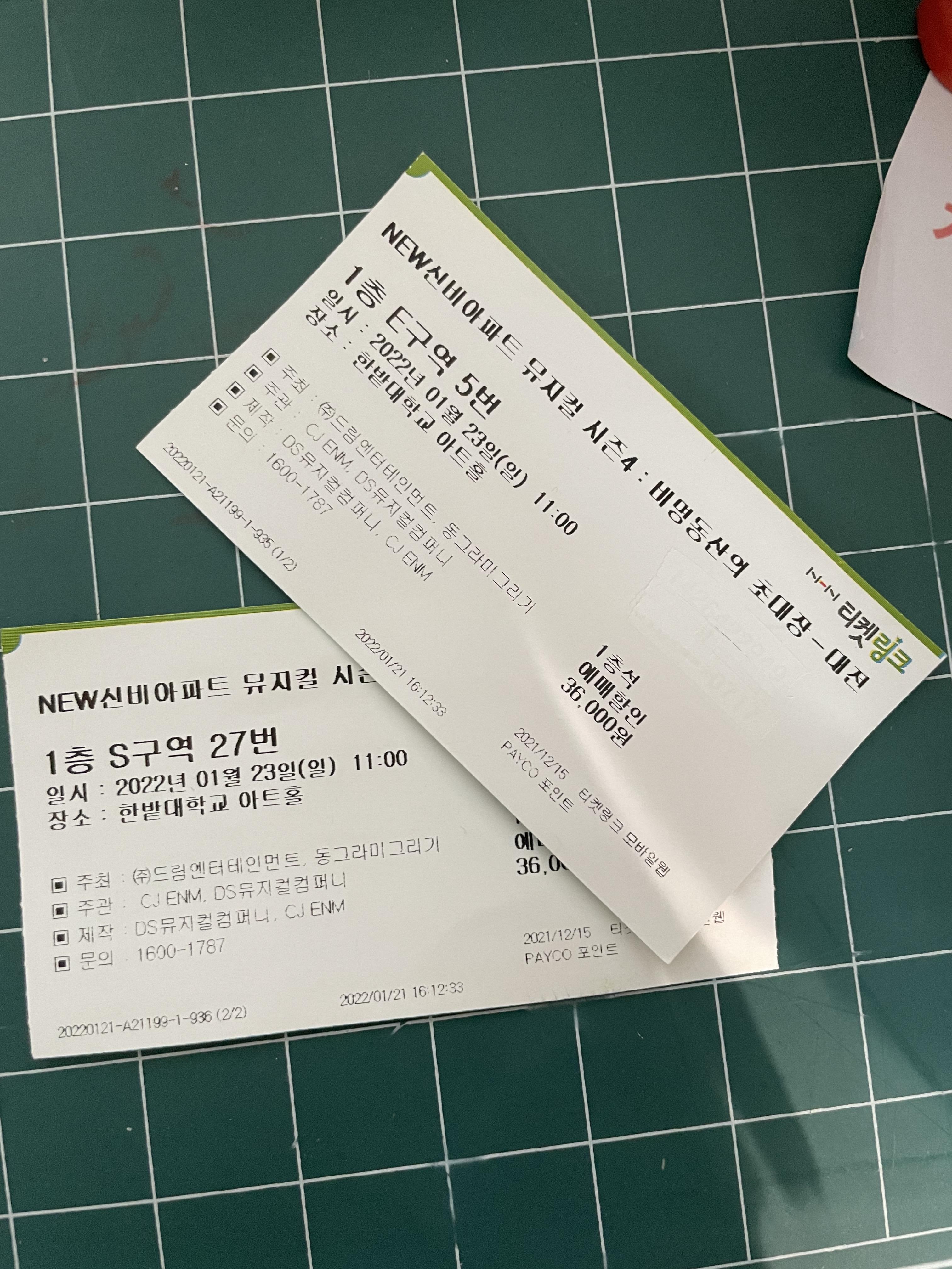 붙어있는 자리가 없어서 앞자리 S구역 27번, E구역 5번 자리를 예매했어요