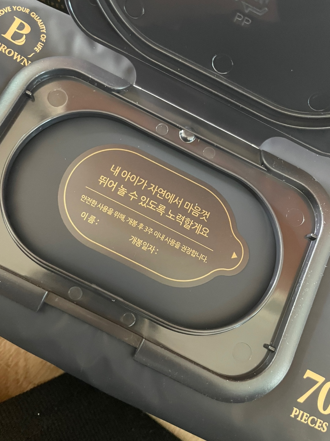브라운 물티슈는 캡을 열면 이름과 개봉일자를