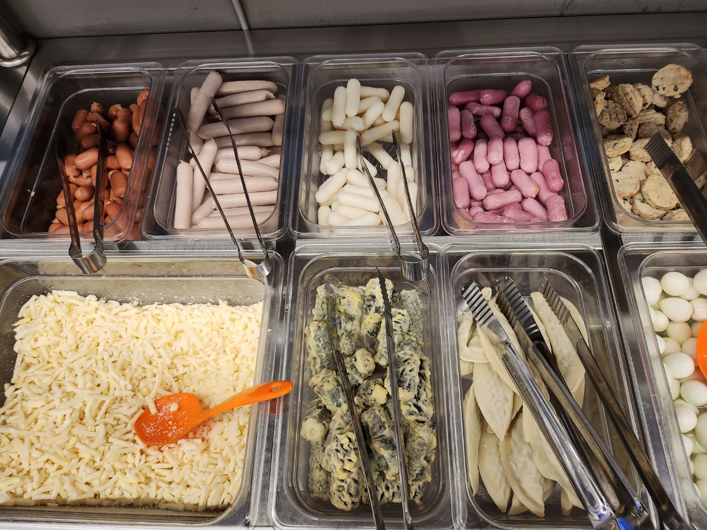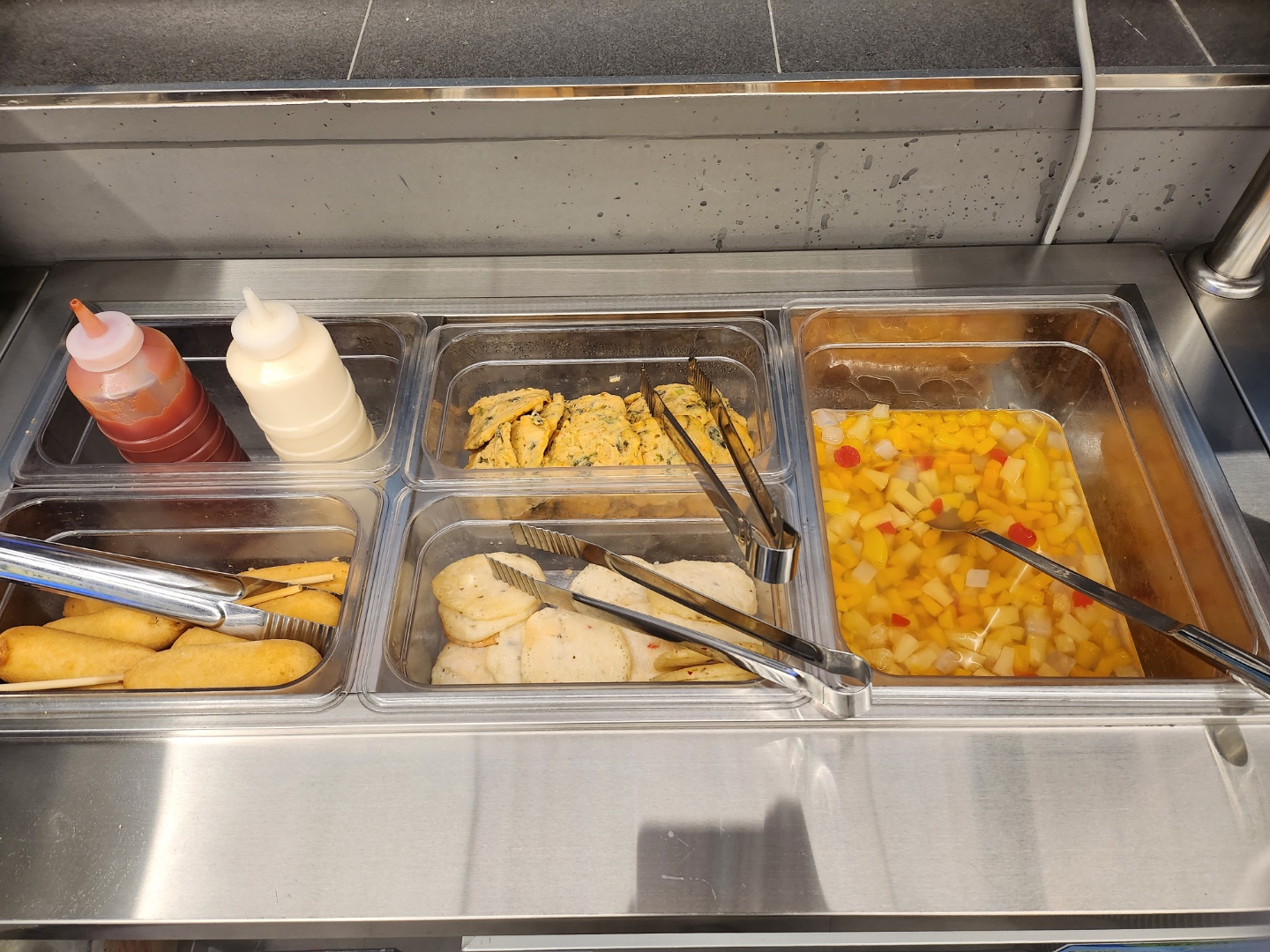 소세지, 치즈떡, 김말이, 부침개, 후르츠칵테일,
