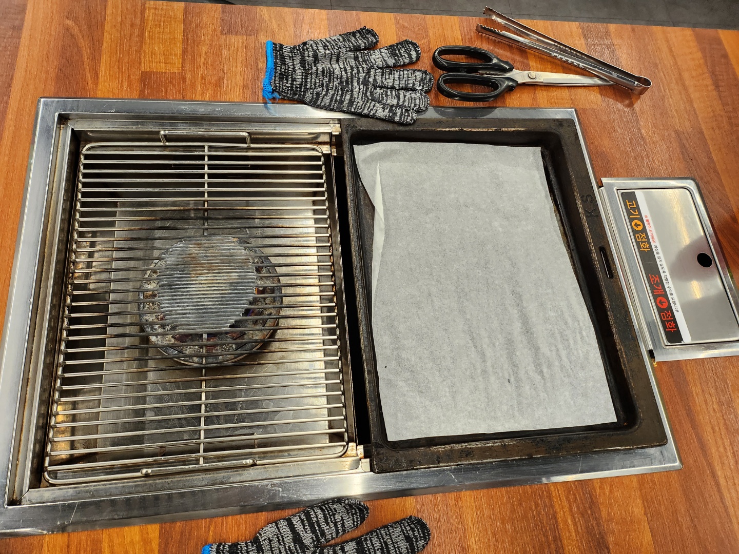 왼쪽은 조개 구이판 / 오른쪽은 고기판이에요