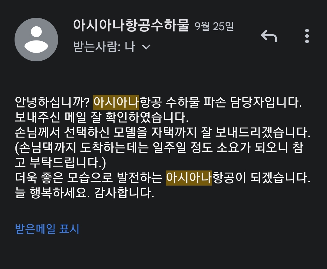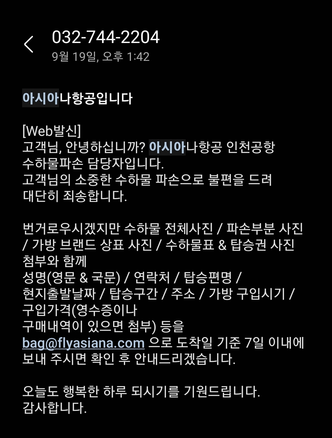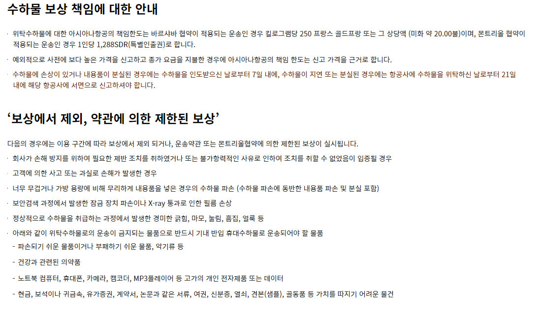 단, 파손된 수하물은 회수를 원칙으로 합니다.