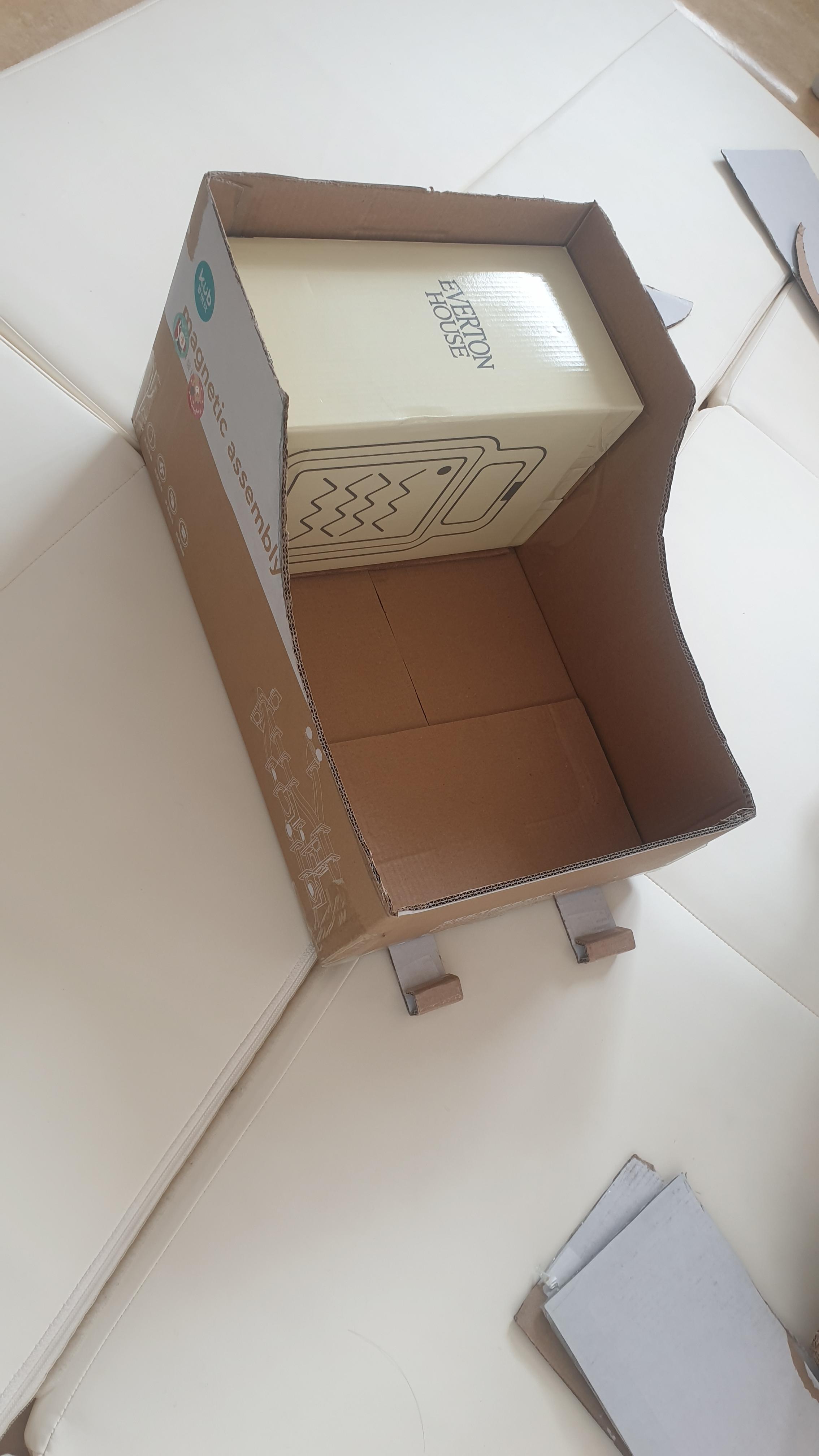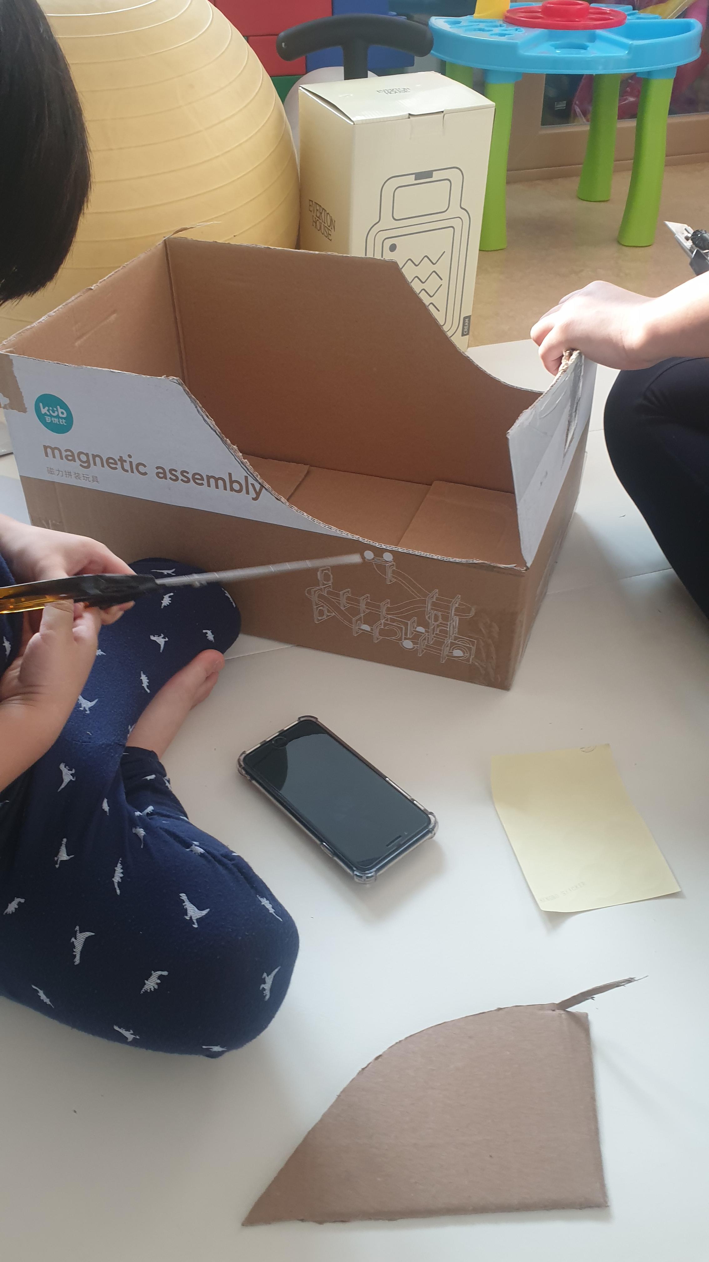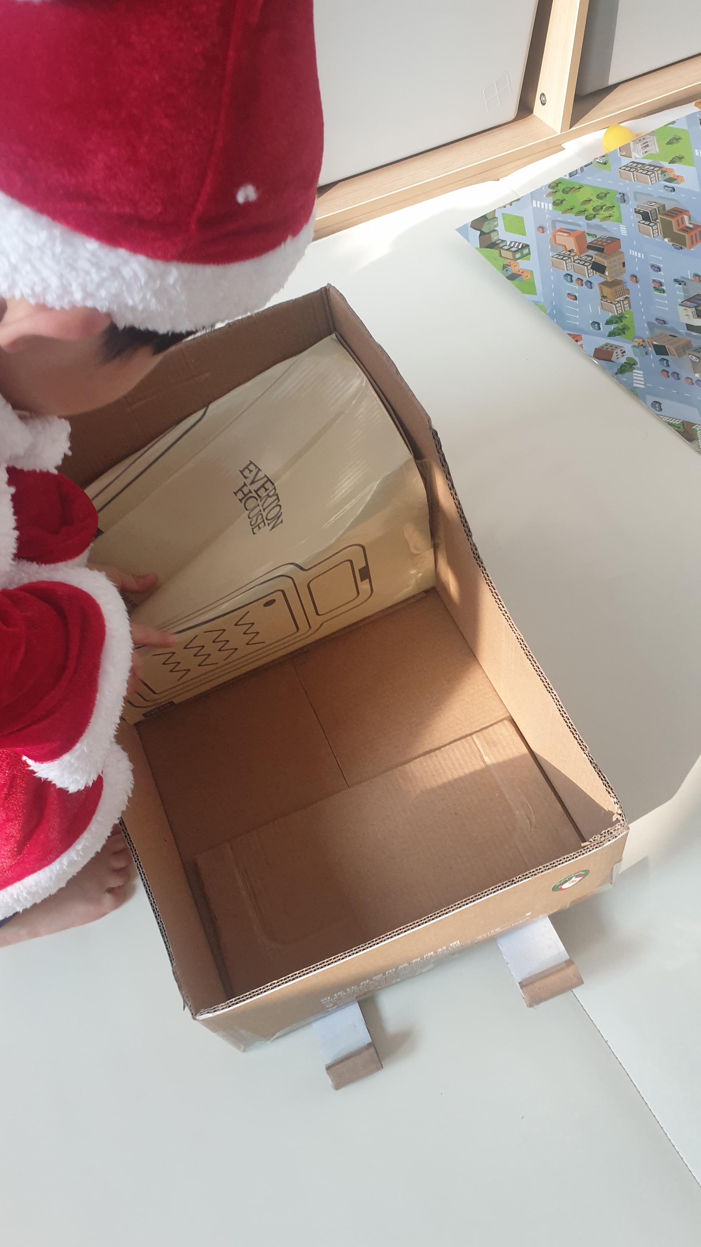 앞에 모양도 만들고 아이가 앉을 수 있게 작은 박스를 넣어줬어요