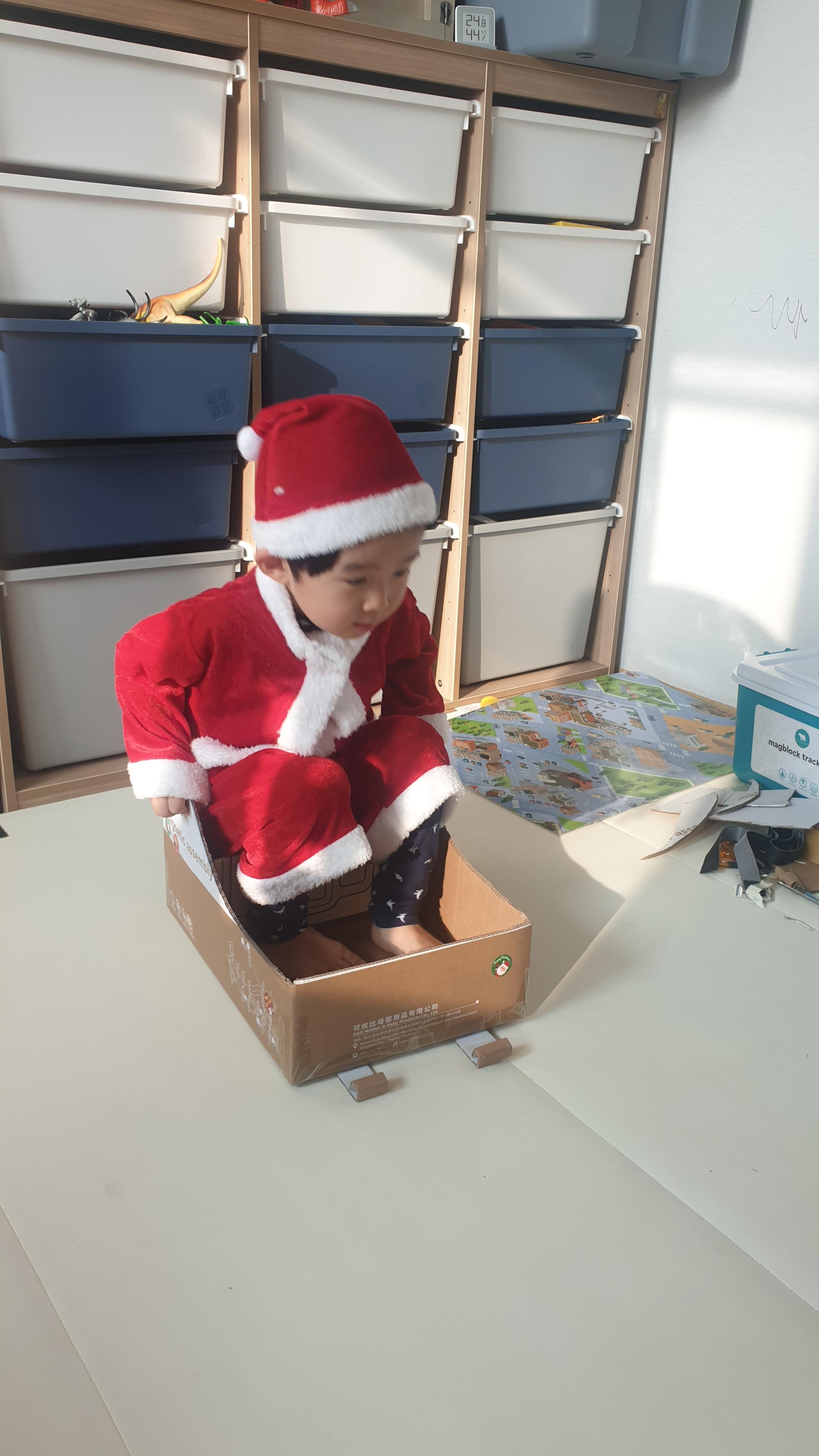 썰매 탈 생각에 신난 아들은 바로 산타옷으로 갈아입고 왔어요