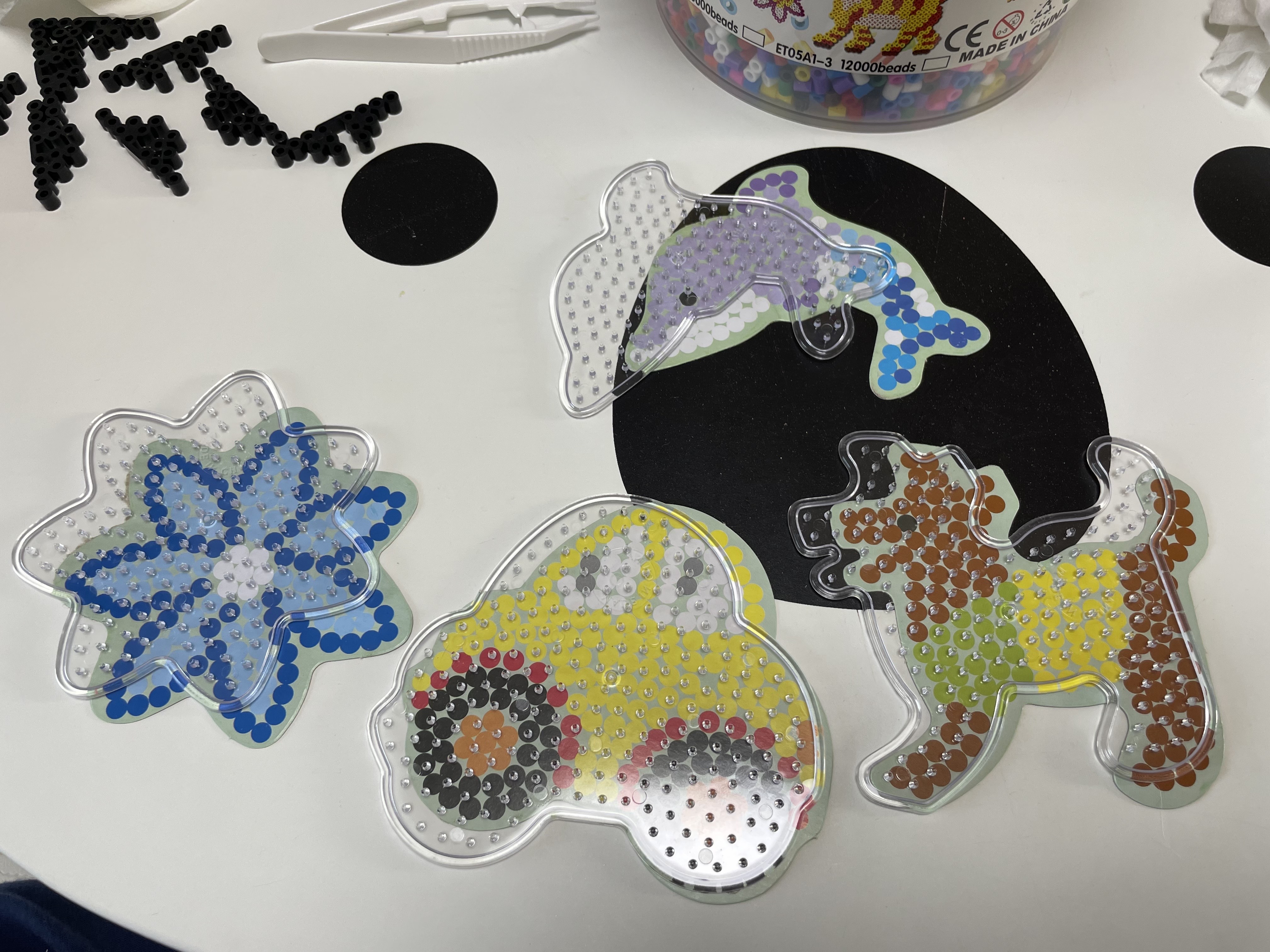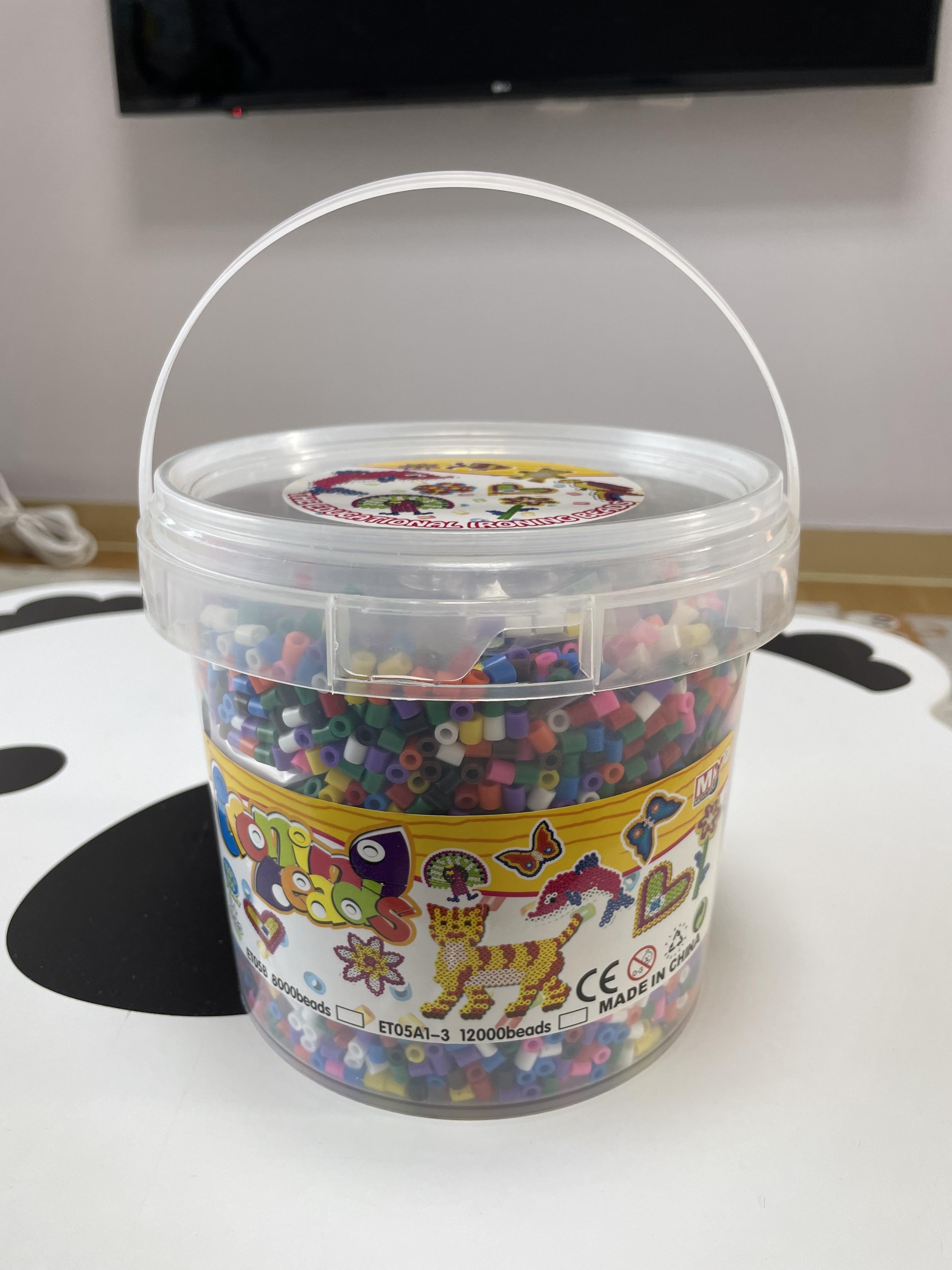 비즈 통 안에는 비즈 12,000 pcs와 비즈 놀이판 4종류와 집게, 유화지 4장이 들어있어요