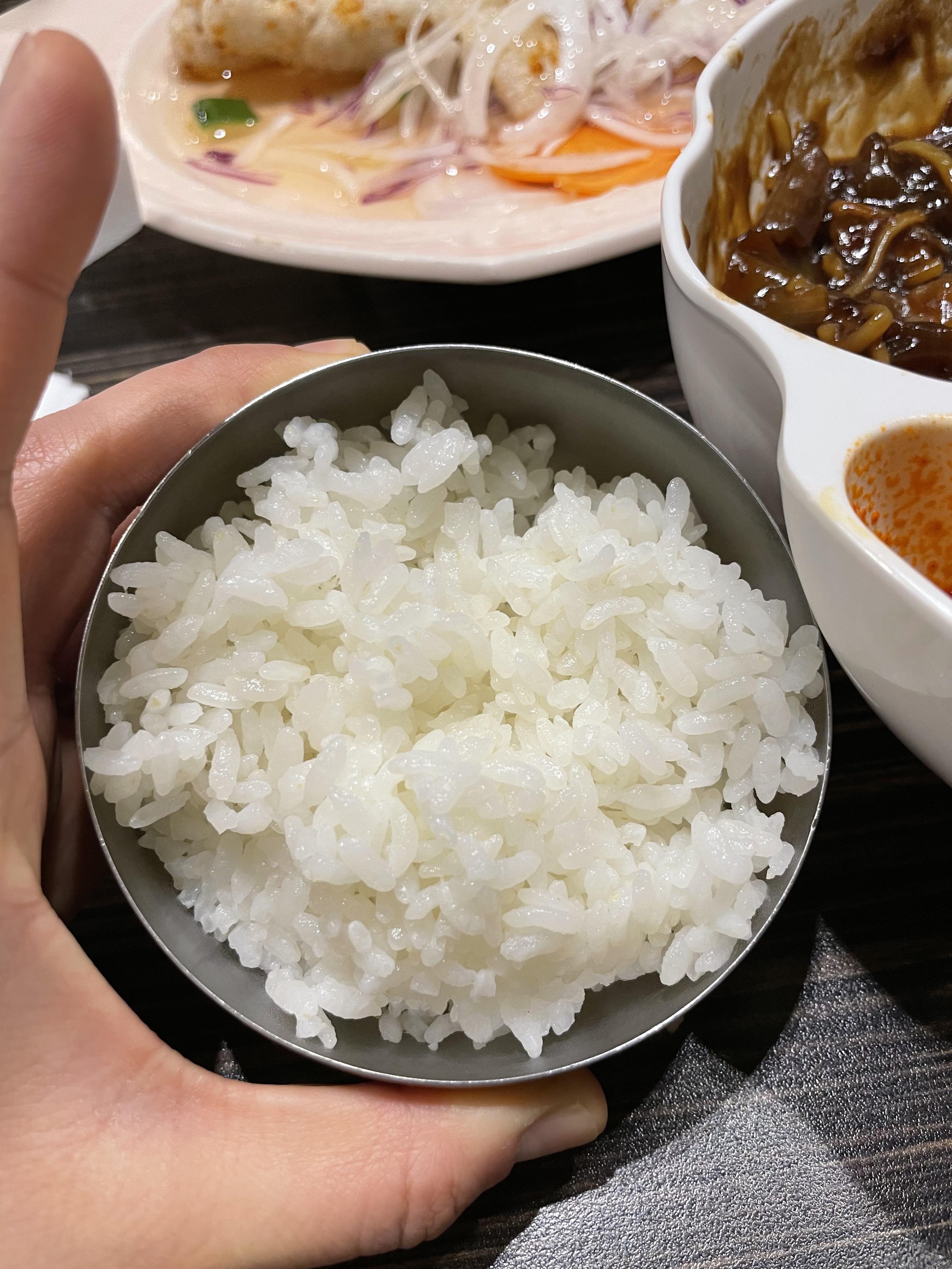 단무지, 짜쌰이, 밥, 물, 김치, 앞접시