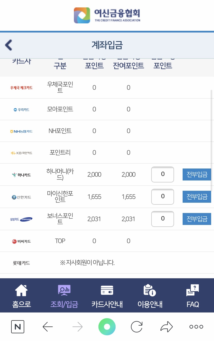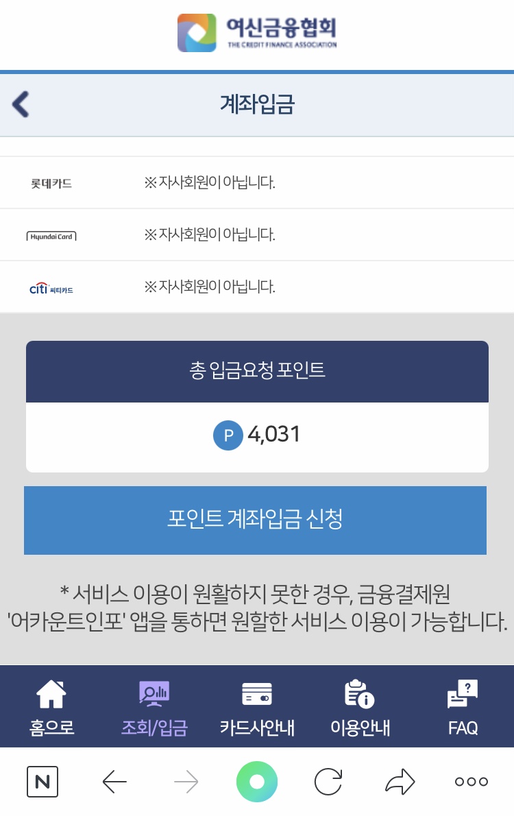 그리고 카드사별 1일 1회만 입금 신청이 가능하다고 하니 참고하세요**