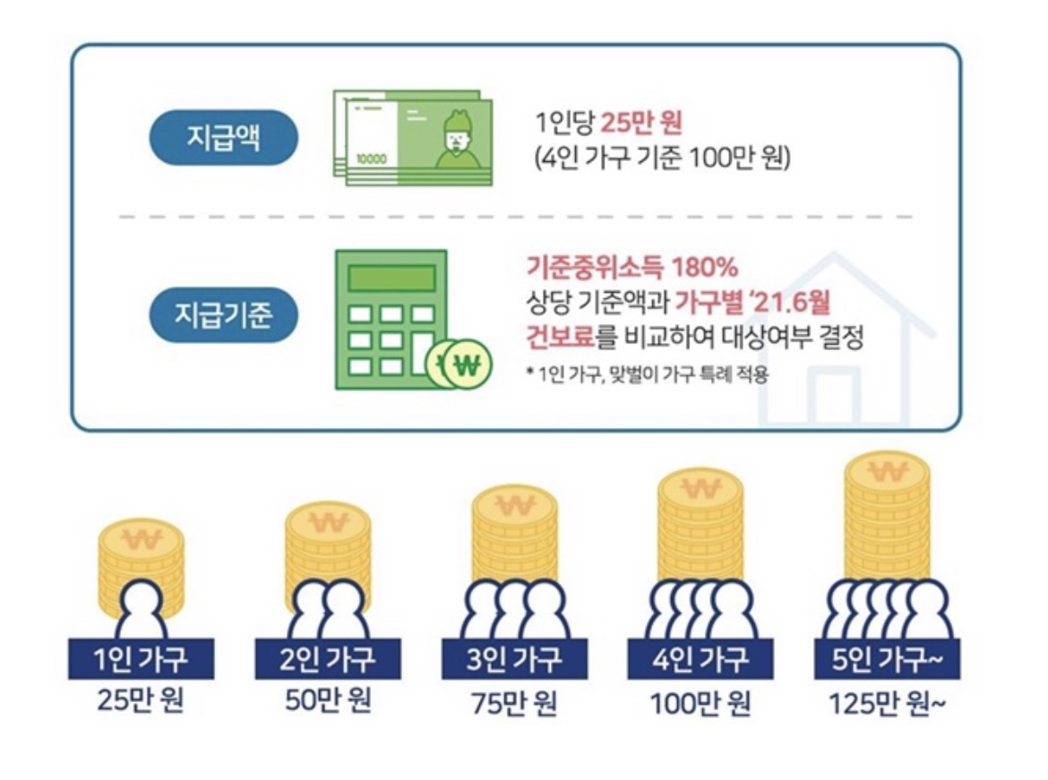 - 코로나바이러스 감염증-19(COVID-19) 장기화로 피해를 입은 다수의 국민들을 두텁게 지원하기 위하여 지급하는 지원금으로 가구별 ’ 21.6월 건강보험료가 국민 지원금 건강보험료 기준액(기준 중위소득 180% 상당) 보다 낮을 경우 지원대상에 해당합니다.