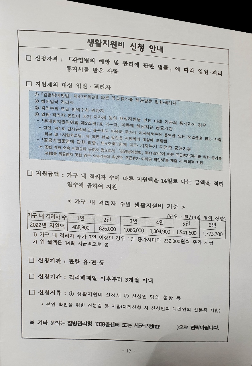 단, 격리자가 2인 이상인 가구는 15만원 ( 동일기간 ) / 금액 고정