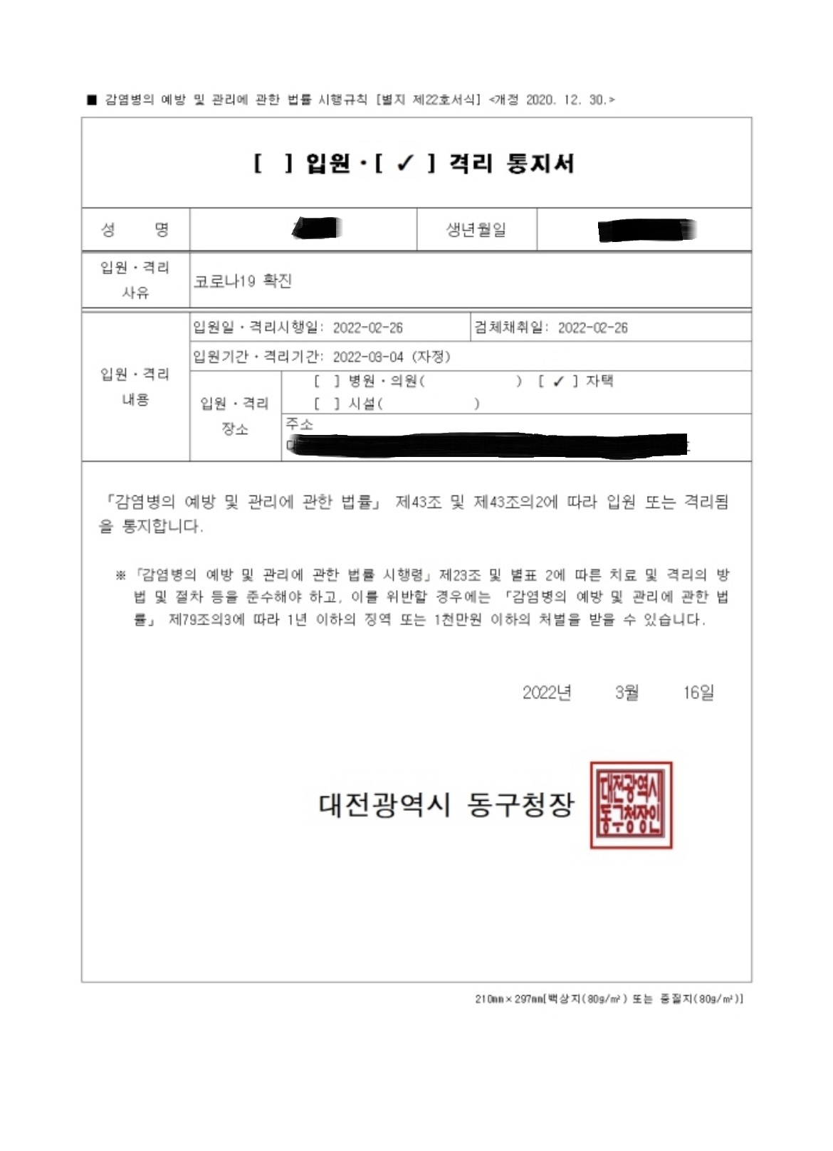 - 2022년 2월 14일 이전 격리 시작 : 격리 해제일로 부터 별도 공지시 까지
