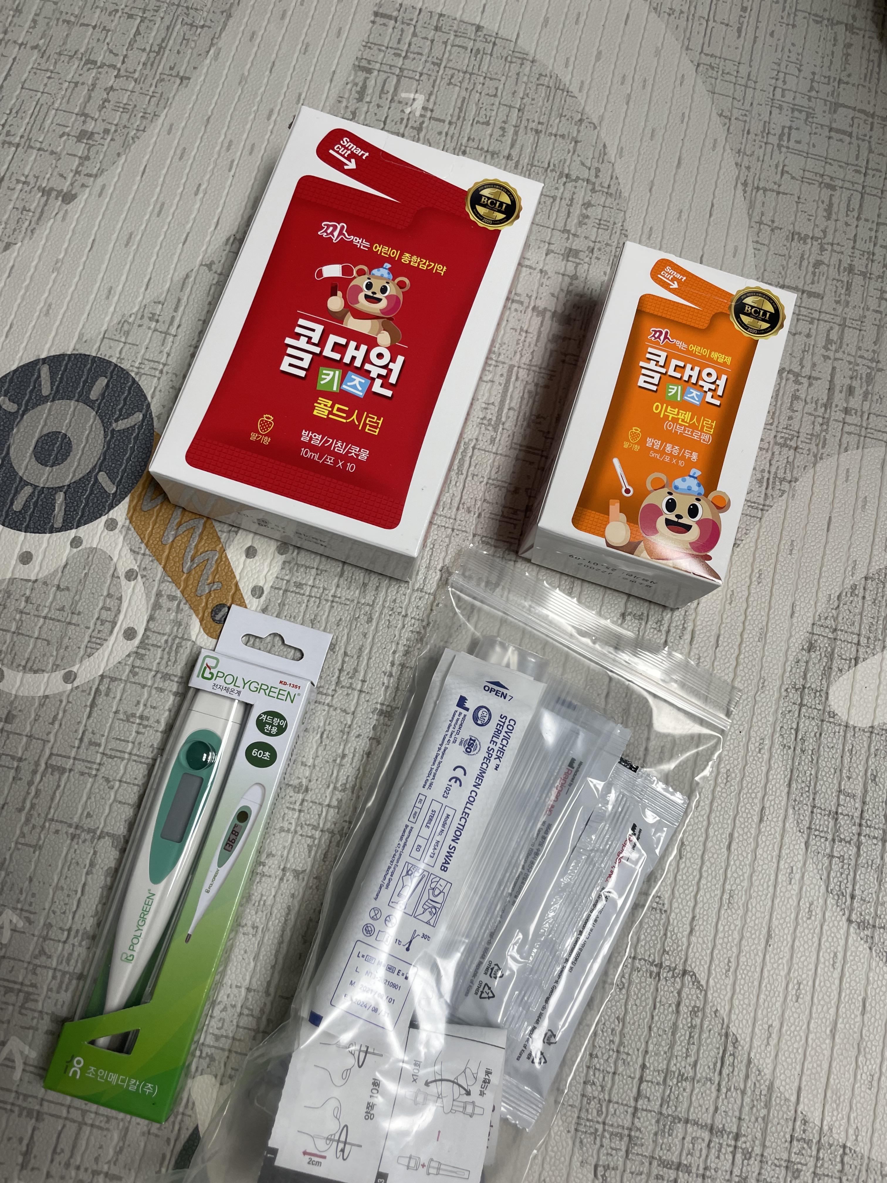 의약품 ( 어린이 해열제, 어린이 종합감기약 ), 체온계(액와), 자가검사키트3개 에요