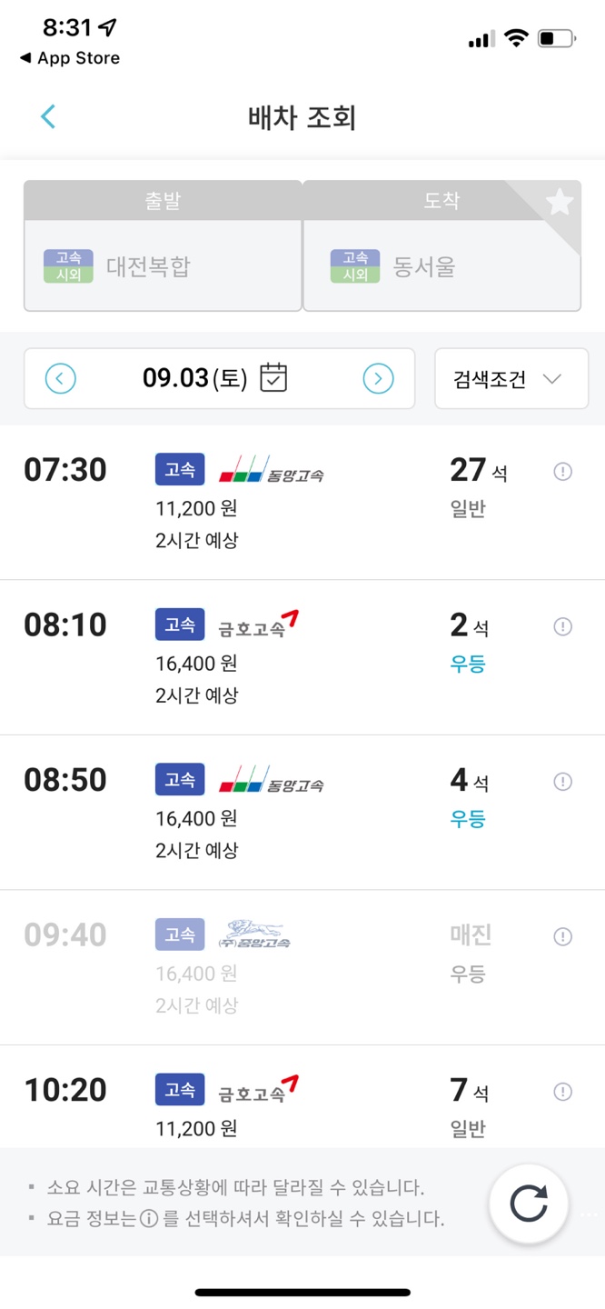 대전 복합터미널에서 동서울터미널로 가서